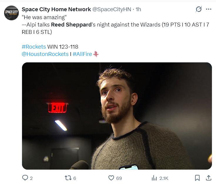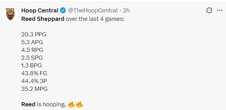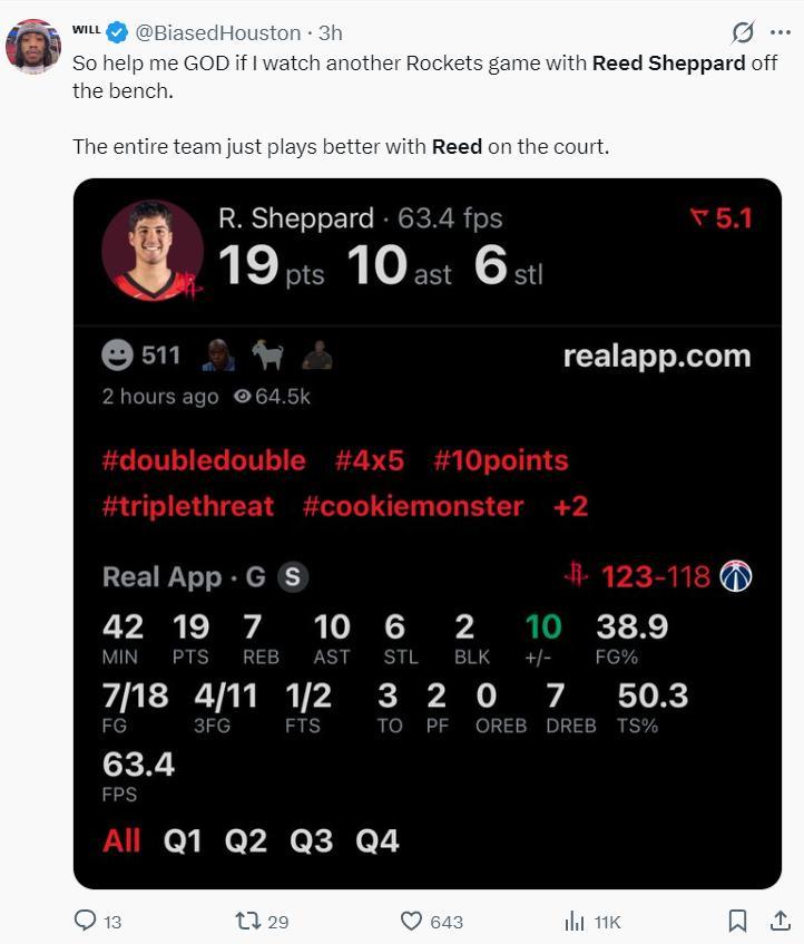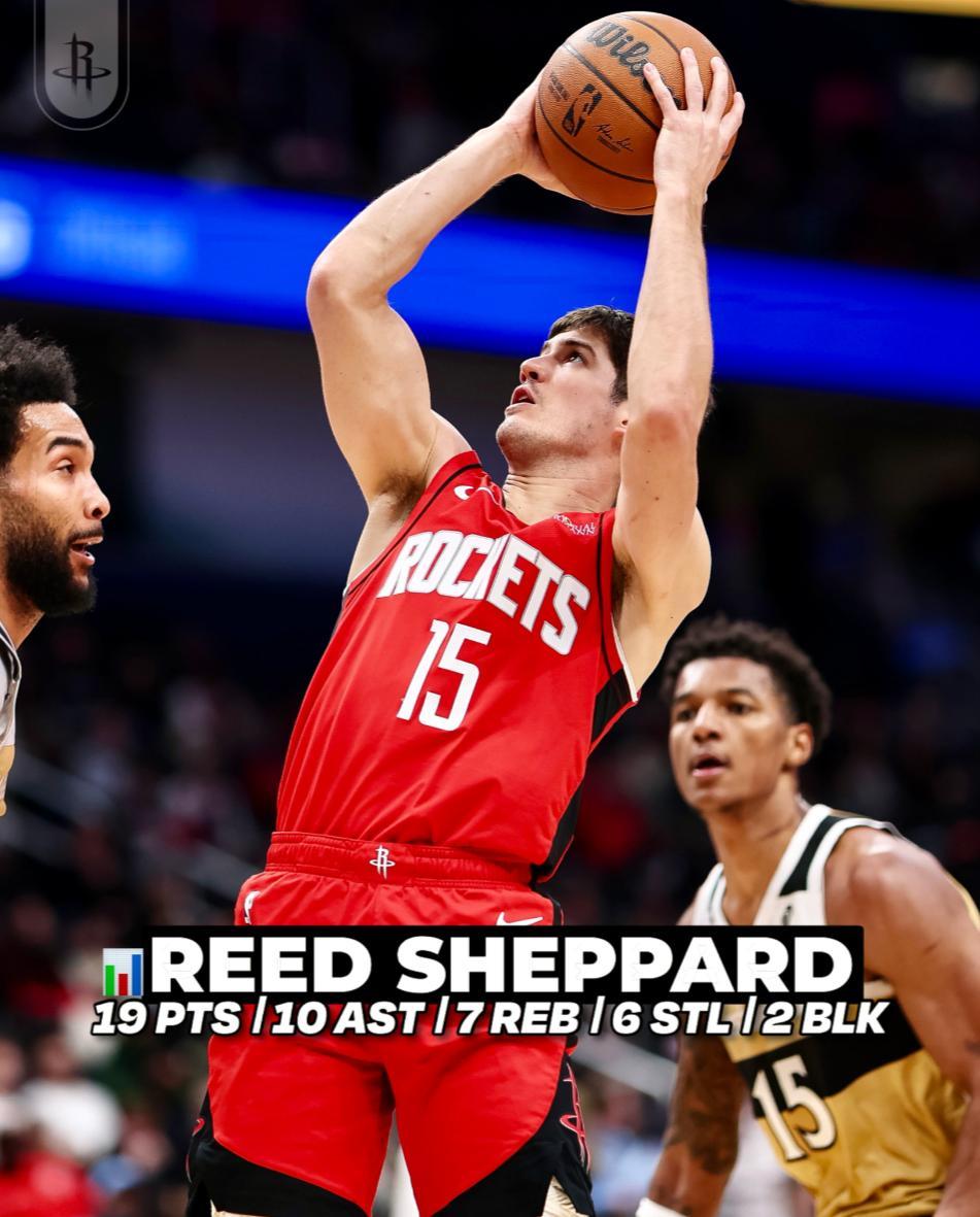 此役後謝潑德最近四場比賽,場均35.2分鐘,拿到20.3分5.3助攻4.5籃板2.5搶斷1.3蓋帽,三分命中率44.4%,他本賽季先發的9場比賽火箭7勝2負。