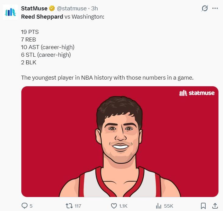 4.謝潑德成爲最年輕拿到19+10+7+6+2數據的球員;