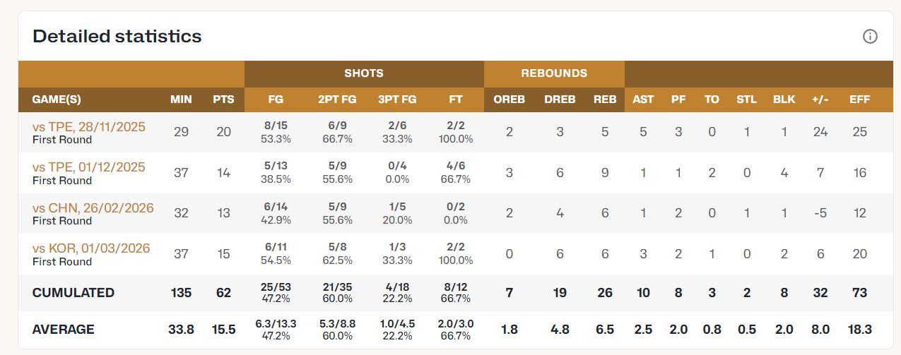 這四場比賽渡邊場均33.8分鐘,拿到15.5分6.5籃板2.5助攻0.5搶斷2蓋帽,命中率47.2%,三分命中率22.2%,作爲日本核心球星他這個數據其實非常一般,要知道韓國核心鋒線李賢重場均24.3分,三分命中率高達45%