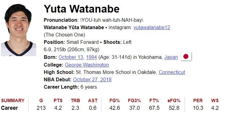 渡邊雄太更是前NBA球員,他在NBA打了213場比賽,場均4.2分2.3籃板0.6助攻,命中率42.6%,三分命中率37%,他在NBA只是一個輪換而已。