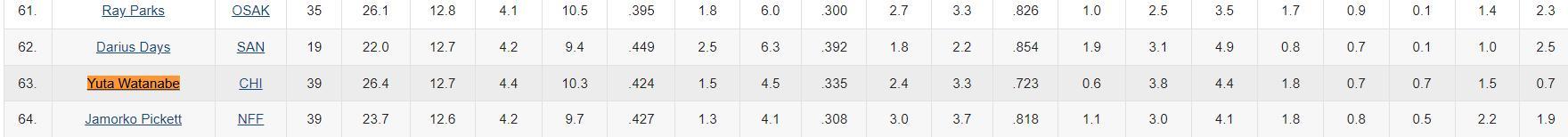 其實本賽季渡邊在B聯賽也屬於二流水準,場均12.7分(聯賽第63)4.5籃板1.9助攻0.8搶斷0.8蓋帽,命中率42.5%,三分命中率33.5%,他在B聯賽也不是頂級水準了,他在囂張什麼?