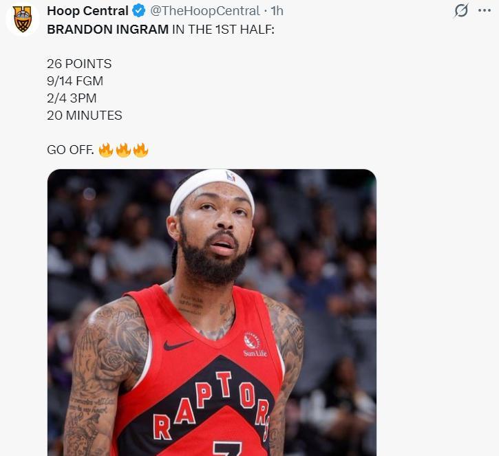 上半場猛龍是靠英格拉姆支撐,20分鐘裏14中9,三分4中2,拿到26分,尤其是首節7中5+三分3中2+罰球4中4,拿到16分,都覺得此役他要以一己之力扛起猛龍了,結果從第三節開始斷電。