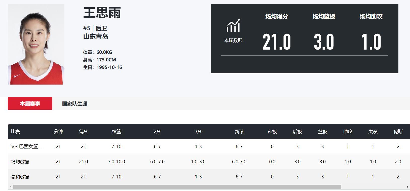 此役王思雨全場比賽替補20分鐘,10中7,三分3中1,罰球7中6,拿到21分3籃板1助攻2搶斷僅1失誤,命中率70%,她的個人表現比多位年輕核心更出色。