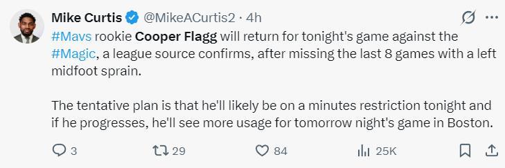 賽前獨行俠記者就報道,弗拉格將在對陣魔術的比賽中復出,此前他因爲左腳踝扭傷缺席了八場比賽,他這場比賽會有登場時間限制,如果他的左腳踝傷勢恢復順利,他之後的登場時間會逐漸增加。