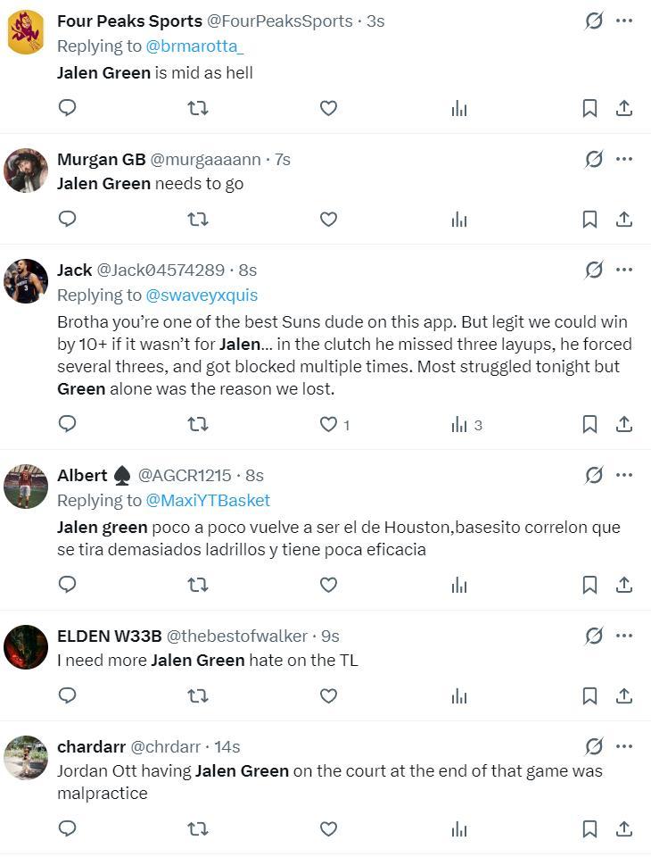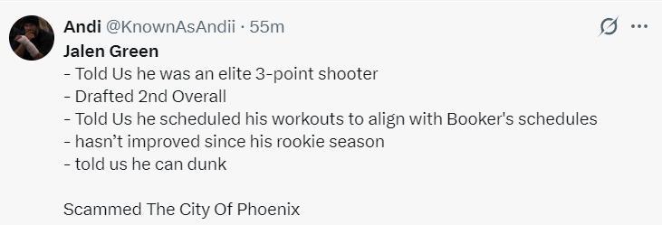 太陽球迷:一開始格林告訴我們他是一位出色的三分投手,他是榜眼秀!告訴我們他與布克的訓練時間是契合的。實際上他自新秀賽季以來一直沒有進步,他詐騙了鳳凰城。