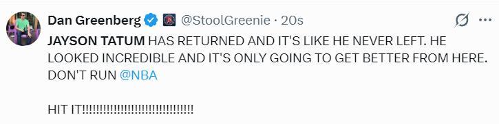 綠凱記者:傑森-塔圖姆終於迴歸了!彷彿他從未離開過一樣,他看起來狀態很好,而且接下來會越來越好。