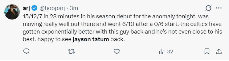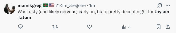 綠凱球迷:塔圖姆開場狀態有些不穩定或許是還有些緊張,但對塔圖姆來說這已經是一個相當不錯的夜晚。