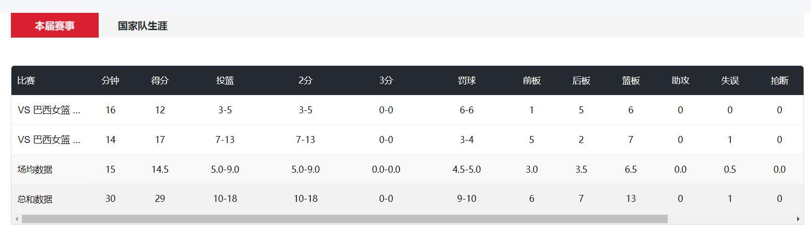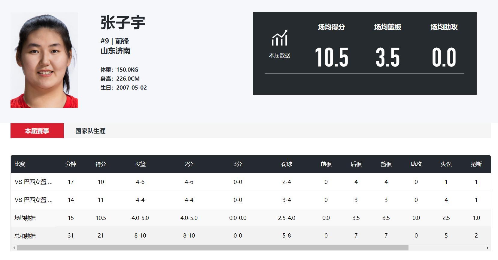 對陣巴西女籃的兩場比賽,張子宇都是替補登場,第一場替補17分鐘,6中4拿到10分4籃板1搶斷,第二場替補登場14分鐘,4中4+罰球4中4拿到11分3籃板,效率值都非常之高。