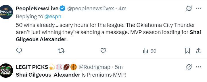 美媒:雷霆已經拿到第50場勝利,雖然這場勝利讓人膽戰心驚。亞歷山大將延續自己的MVP賽季。