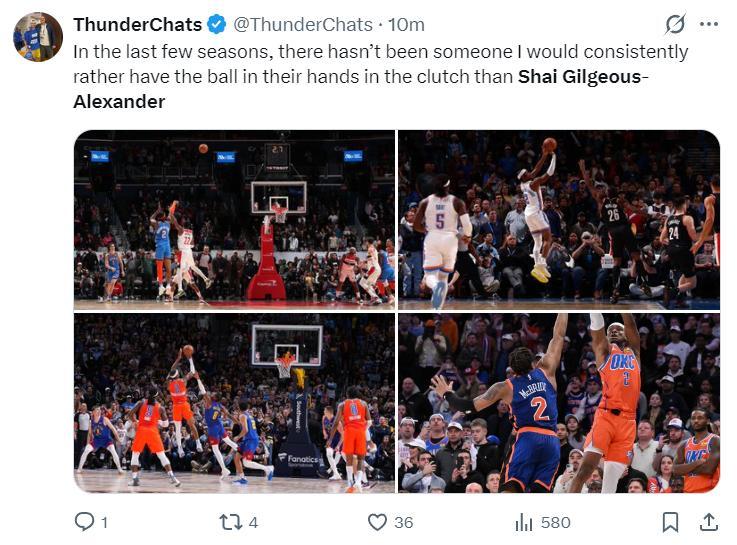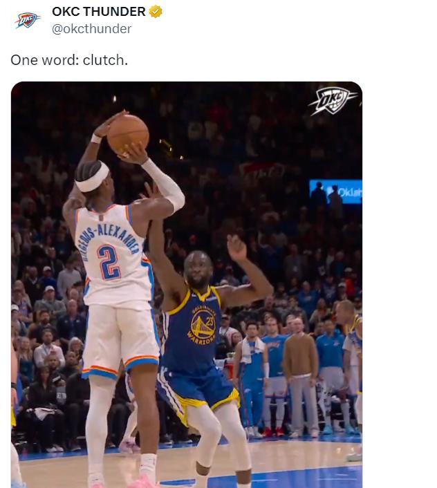 雷霆媒體:在過去幾個賽季裏,沒有哪位球員在關鍵時刻的能力比亞歷山大更強,我們都願意將關鍵球交給他。