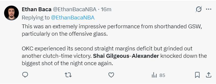 隨後波爾津吉斯關鍵中投不中,多爾特保護後場籃板,SGA持球推進被桑托斯犯規,終場前27秒SGA兩罰全中後這場比賽也失去懸念,關鍵時刻亞歷山大一人連拿5分這就是超巨本色。