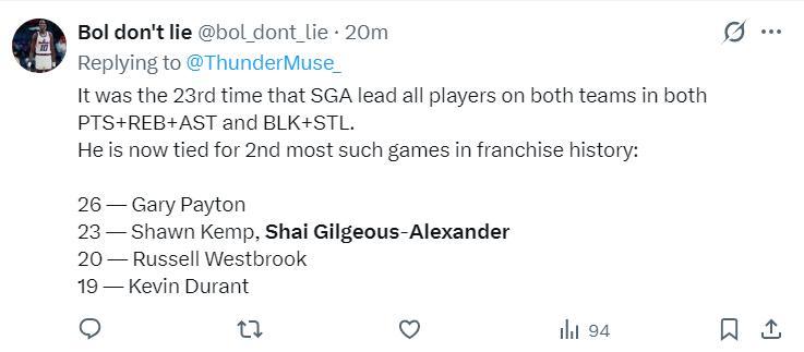 這場比賽後SGA也延續自己連續125場20+的紀錄,距離超越張伯倫只差2場;這也是SGA第23次在得分、籃板、助攻、蓋帽、搶斷五項數據都領跑兩隊,排在歷史第二多,第一多的手套佩頓。