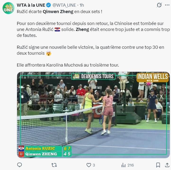 另一歐媒寫道:魯季奇直落兩盤鄭欽文,這是中國選手鄭欽文復出後的第二項賽事,但鄭欽文明顯狀態不佳失誤太多。魯季奇再一次取得漂亮勝利,這是她在最近兩項賽事中第四次擊敗世界排名前30的選手。