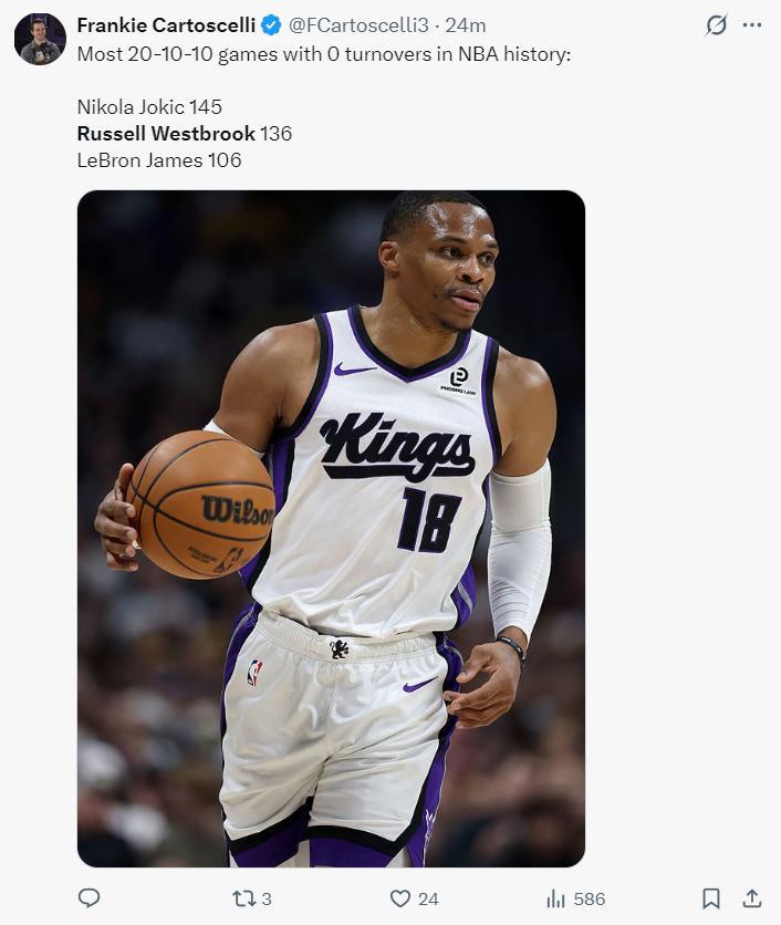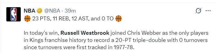 8.威少與韋伯一同成爲國王隊史唯二能拿到20+三雙且0失誤的球員。