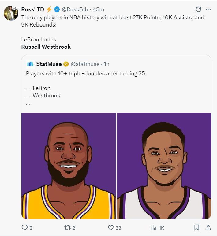 7.NBA歷史上只有兩人能拿到27000分+10000助攻+9000籃板,威少、詹姆斯。