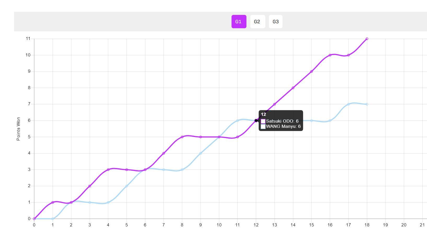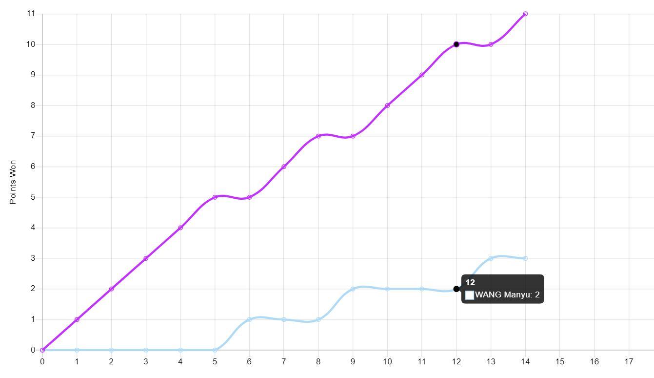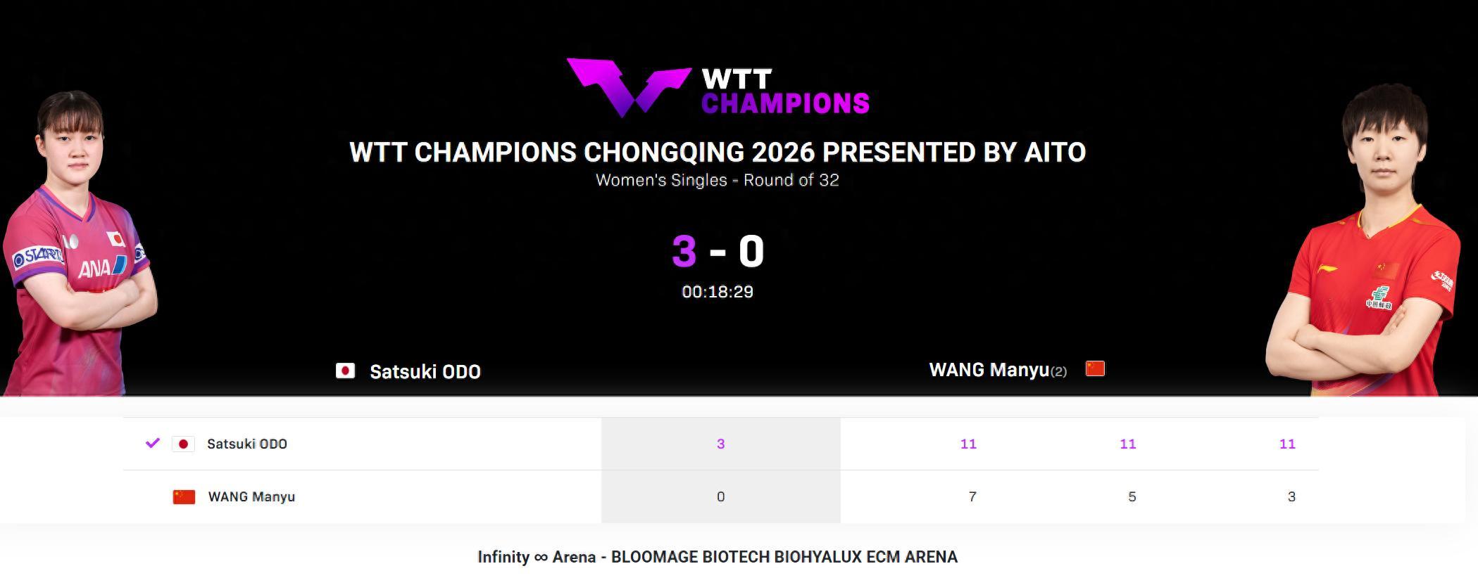 第三局跟第二局的情況差距不大,開場大藤5-0領先,隨後大藤7-1領先,直接10-2就拿到賽點,最終11-3速勝,整場比賽只耗時18分鐘,說王曼昱是一敗塗地也絲毫不爲過。