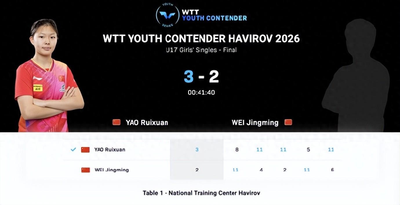 北京時間3月11日,WTT青少年常規挑戰賽哈維若夫站丨U17女單決賽,國乒內戰,姚睿軒3-2逆轉魏璟茗拿到冠軍,五局比分:8-11,11-4,11-2,5-11,11-6。16歲的姚睿軒在短短三天時間裏拿到了1冠1亞,她的上升勢頭很猛烈。