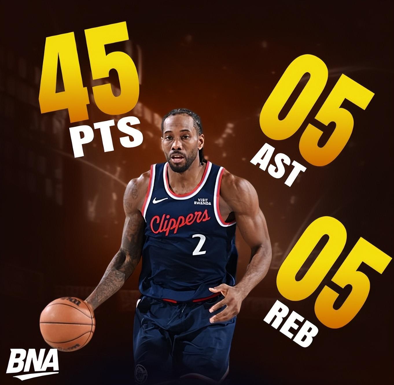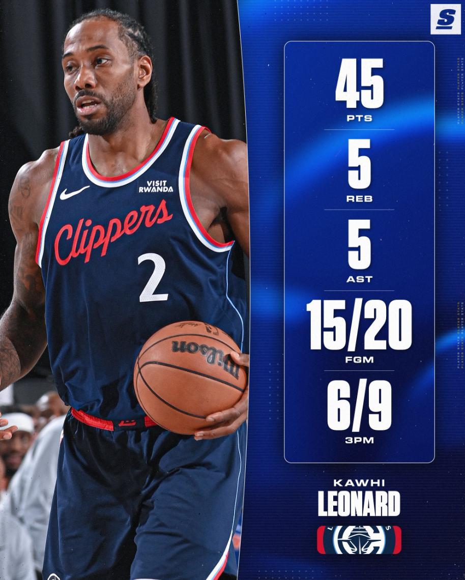 此役倫納德開場就火力全開單節10中8拿到18分,上半場就拿到28分,全場比賽32分鐘,20中15,三分9中6,罰球10中9,拿到45分5籃板5助攻2搶斷1失誤0犯規,命中率75%,三分命中率66.7%,真實命中率92.2%,正負值+41。