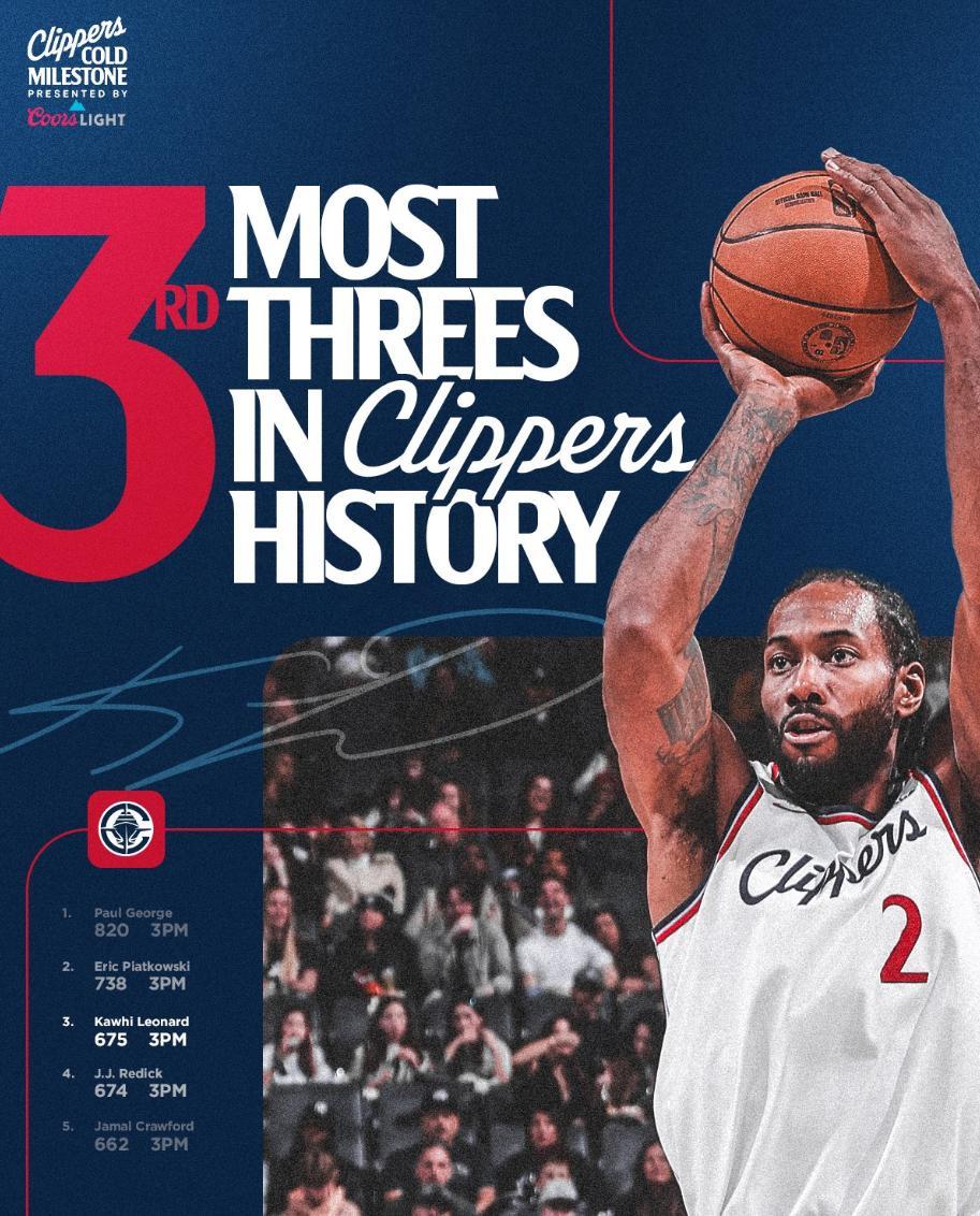 2.倫納德完成675+三分超越雷迪克升隊史第三;