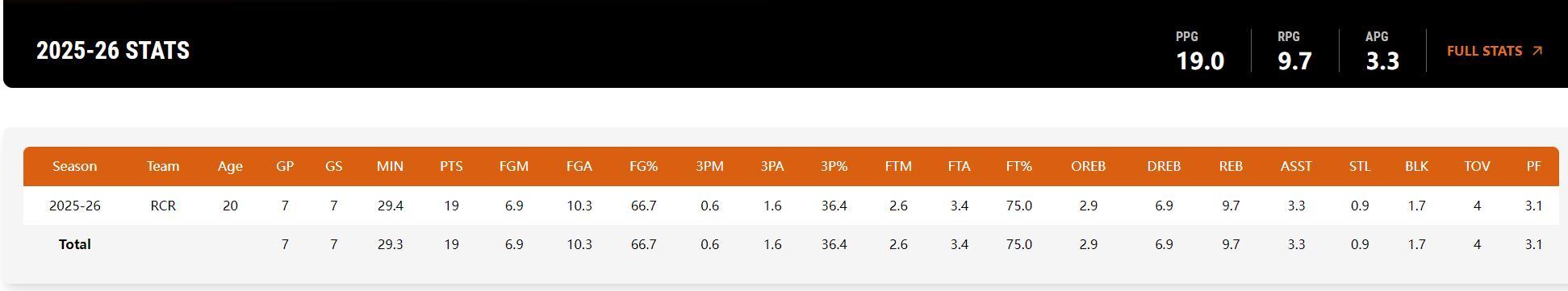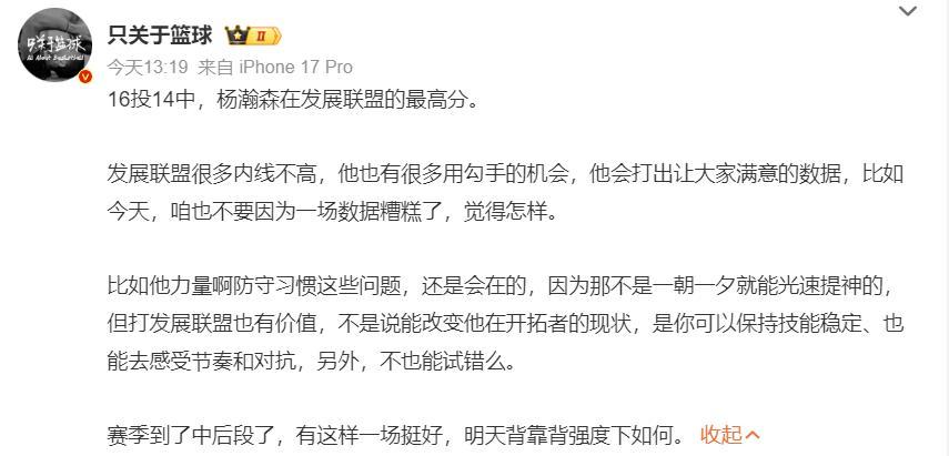 實際上這場比賽後,楊瀚森在G聯賽場均29.4分鐘,拿到19.3分9.7籃板3.3助攻0.9搶斷1.2蓋帽,命中率66.7%,三分命中率36.4%,這個數據真的不差。
