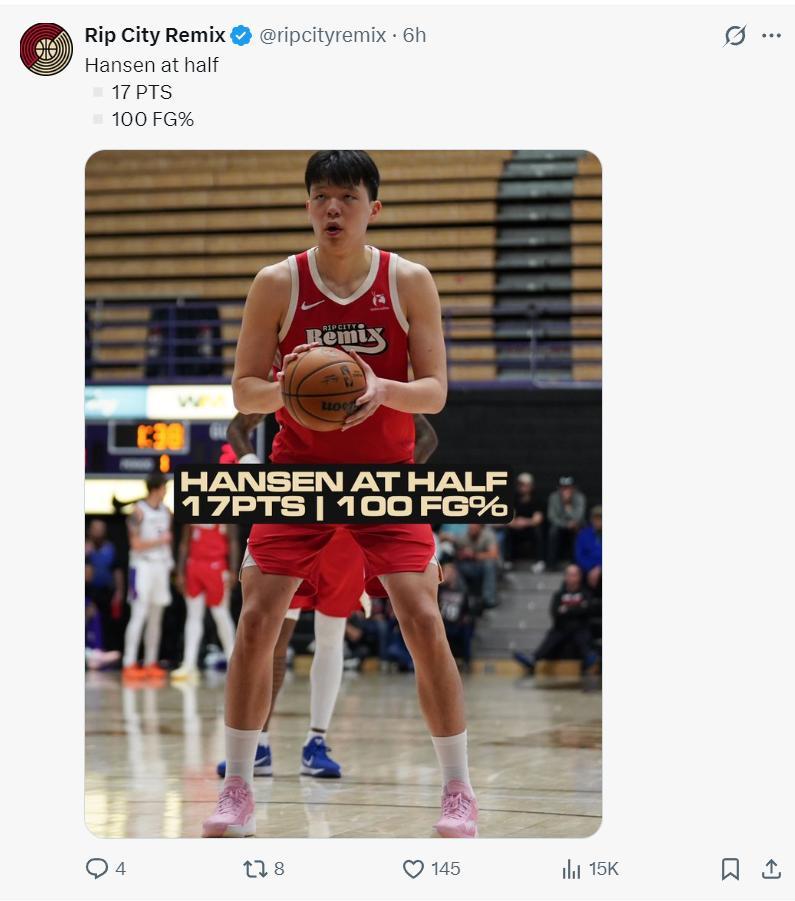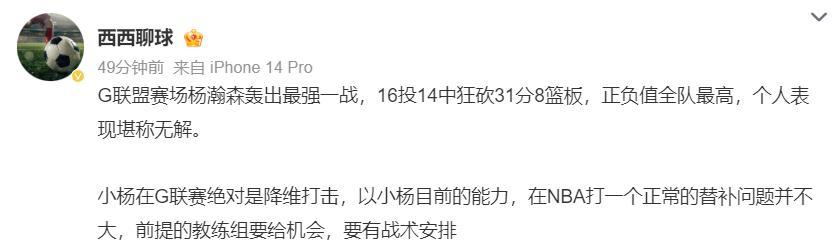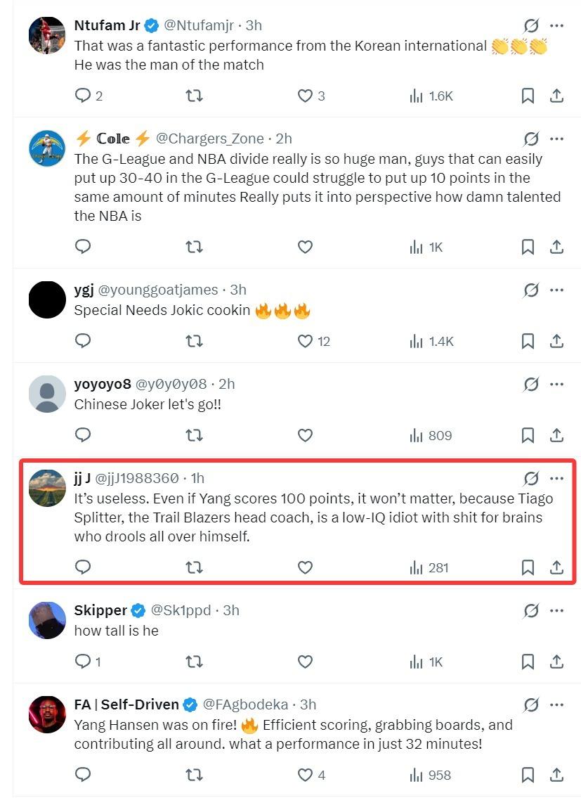 但有一位開拓者球迷寫道:沒用的,就算楊瀚森在G聯賽拿到100分也沒用,因爲開拓者主帥斯普利特是一個低智商、愚蠢的主帥,他不會給楊瀚森機會的。