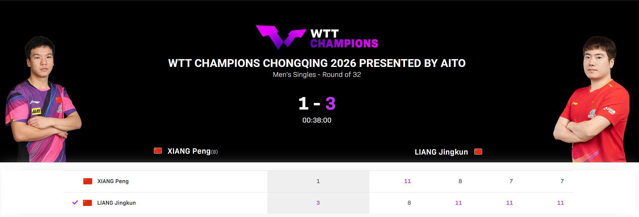 爲什麼說這場比賽是爆冷呢?29歲的梁靖崑世界排名已經跌至第13位,而23歲的向鵬世界排名是第九,最終梁靖崑是3-1淘汰向鵬這就是爆冷,四局比分:【8-11,11-8,11-8,11-7】,大胖還是在0-1落後的情況下完成大逆轉。