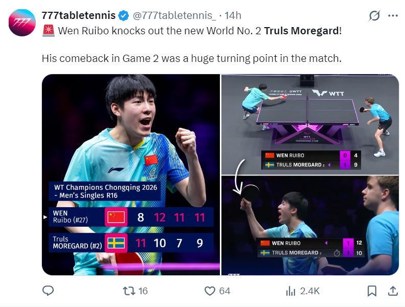 WTT重慶冠軍賽男單1/8決賽,溫瑞博3-1擊敗莫雷加德(世界第二),四局比分:【8-11,12-10,11-7,11-9】。這場比賽溫瑞博在大比分0-1落後的情況下連贏三局,這位國乒19歲的小將製造了一場大冷門。