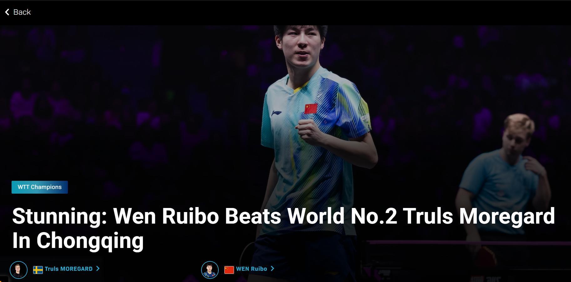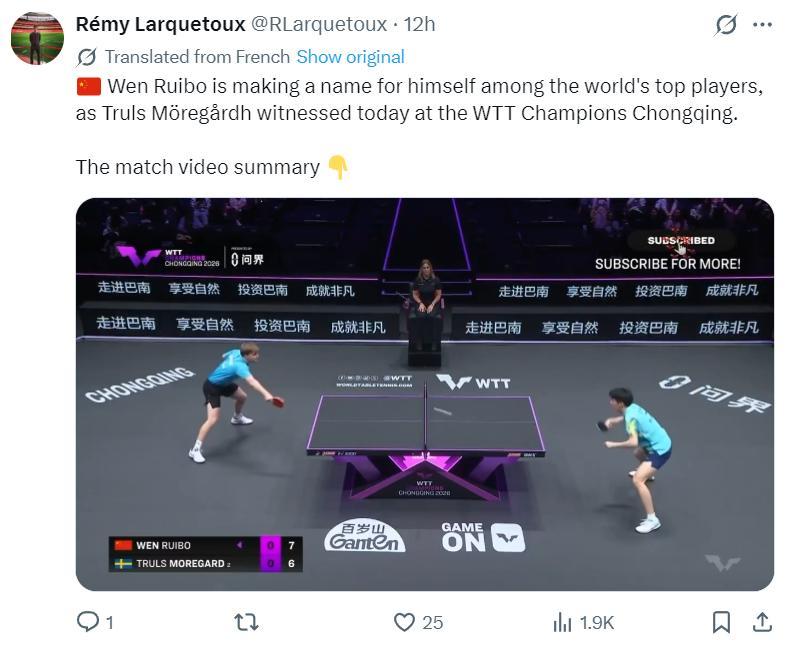 歐洲球迷:溫瑞博在對陣世界最頂尖的選手嶄露頭角,莫雷加德在WTT重慶冠軍賽親自感受了這一切。