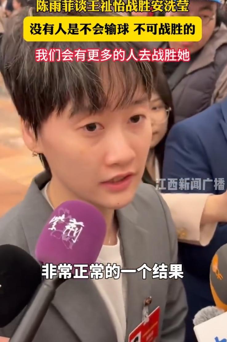 北京時間3月12日,陳雨菲在接受採訪時談到王祉怡擊敗安洗瑩,她說道:競技體育裏面沒有人是能一直獲勝的,就像去年世錦賽半決賽我擊敗她那樣,當時也沒有人覺得我能擊敗她,可我還是贏了(帶傷)。沒有人是不會輸球的、不可戰勝的。那場球王祉怡做了充分的準備,發揮的淋漓盡致,贏球很正常,未來我們中國女單會有更多人去戰勝安洗瑩。
