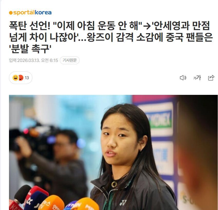 北京時間3月13日,韓媒SPORTALKOREA發文疑似回應陳雨菲的言論,標題爲‘王祉怡炸裂發言擊敗安洗瑩後不願意晨練了,中國粉絲希望她繼續努力,但王祉怡跟安洗瑩的實力差距不是一星半點啊!’