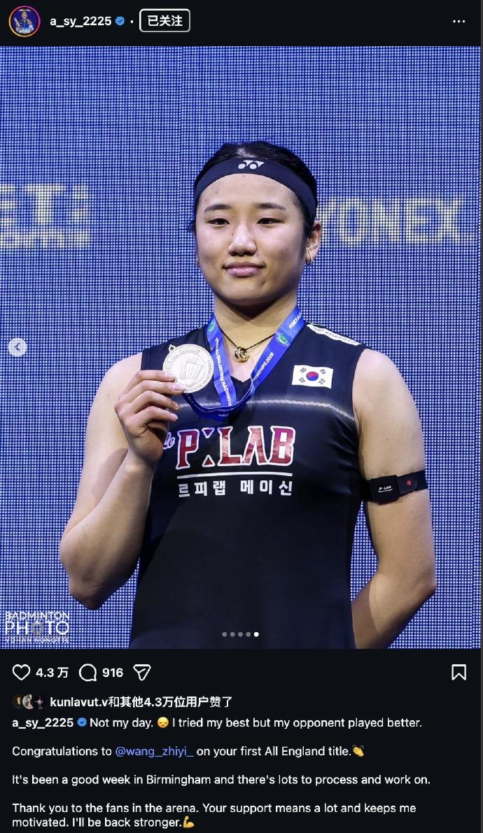 安洗瑩此前在個人IG上發文:這個夜晚不屬於我,我已經竭盡全力但王祉怡的表現確實更勝一籌,祝賀王祉怡奪得個人首個全英公開賽冠軍。在伯明翰這一週收穫頗豐,有很多需要回去總結和提升的地方。也感謝球迷們對我的支持,我會繼續努力訓練變得更強回來。
