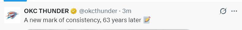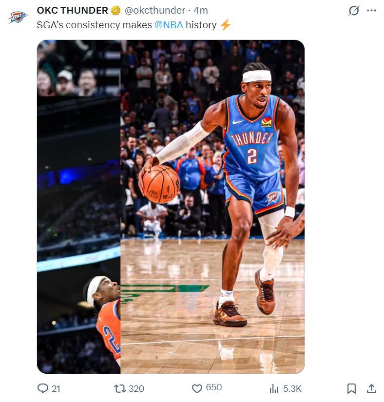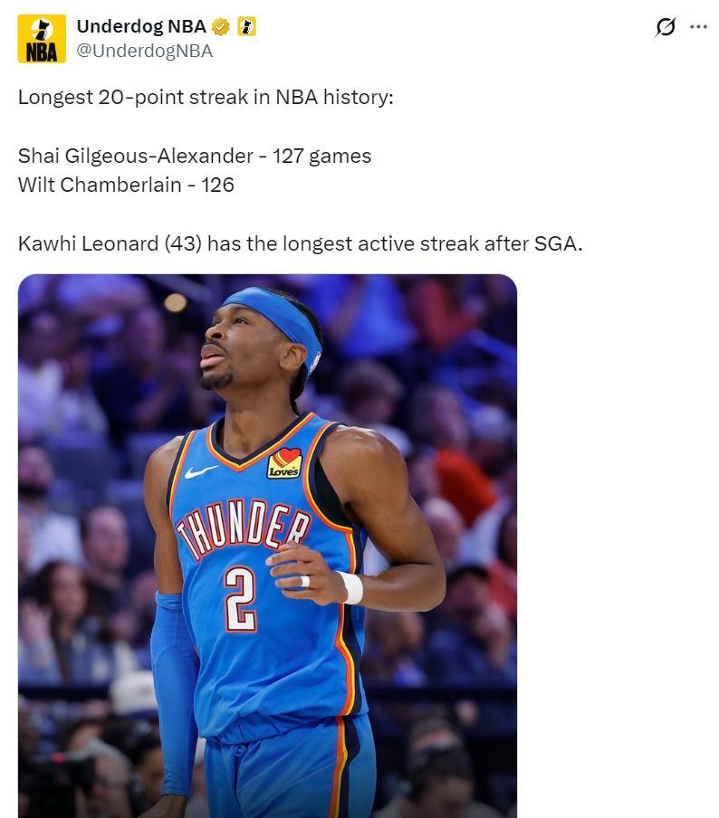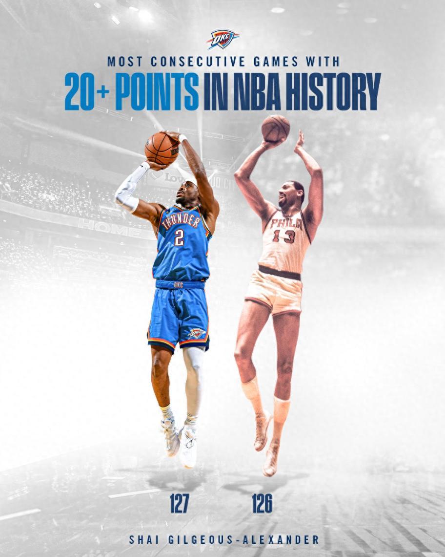 在亞歷山大完成20+後,雷霆官方寫道:時隔63年再度創造一項新的紀錄。
