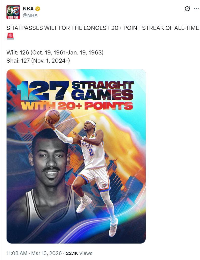 第三節亞歷山大完成21分後,NBA官方曬出張伯倫1961年10月19日-1963年1月19日完成連續126場20+,亞歷山大是2024年11月1日-至今完成連續127場20+,他還將繼續刷新紀錄。