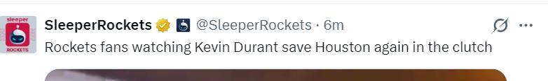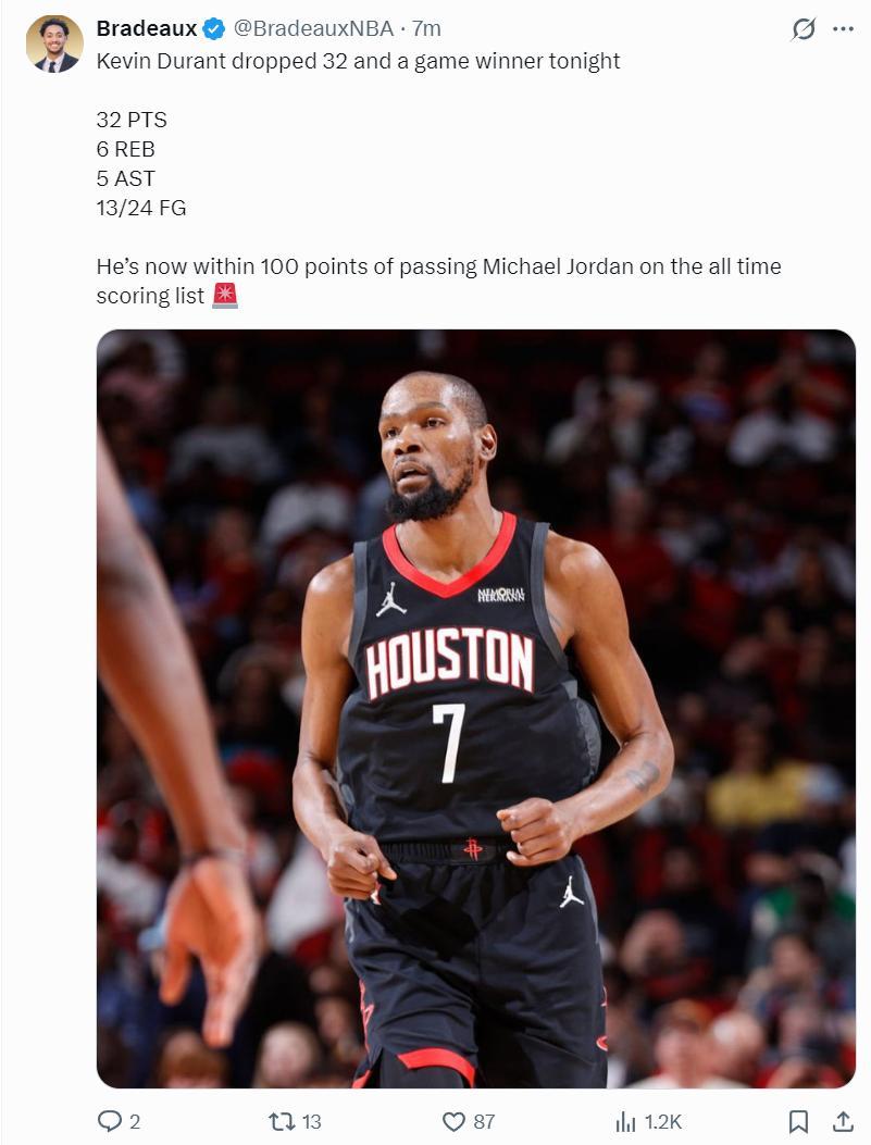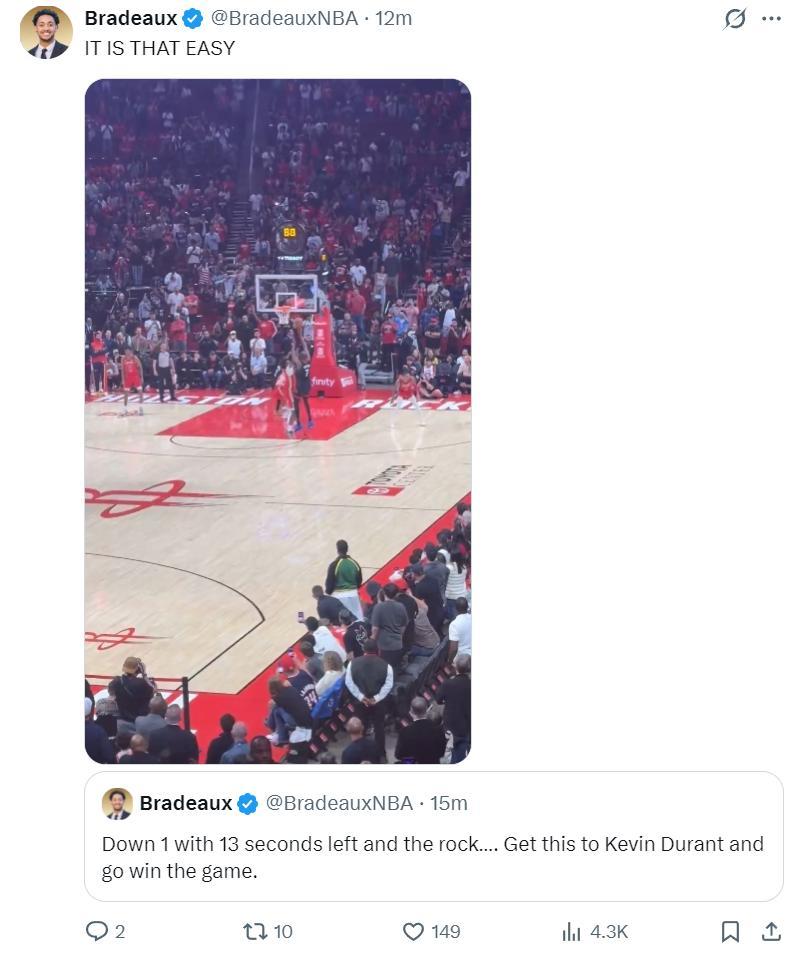 休媒Bradeaux寫道:比賽還剩13秒火箭還落後,那就把該死的球給杜蘭特,然後他會帶我們走向勝利。