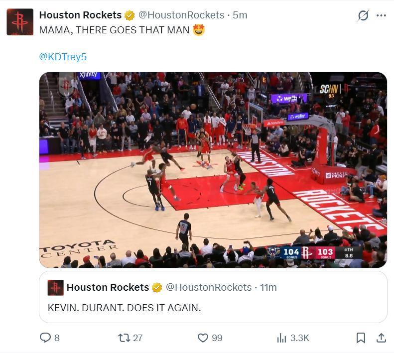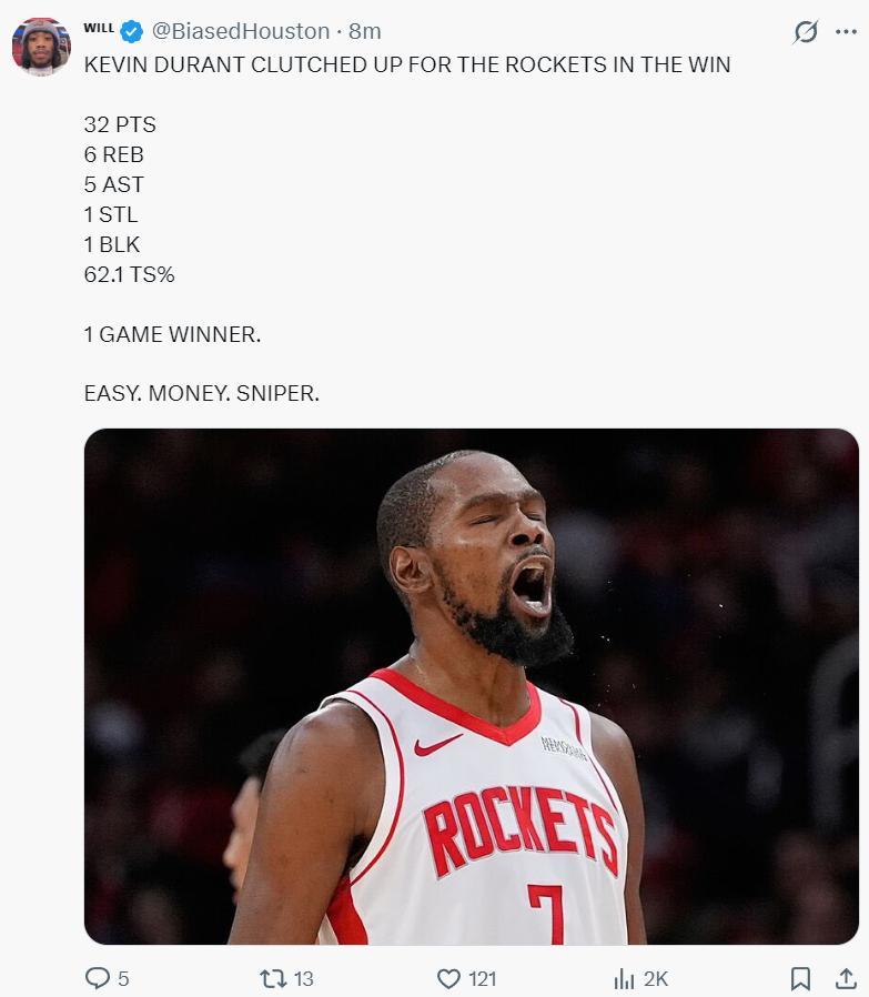 休媒:火箭隊球迷又看着37歲的杜蘭特拯救了球隊,他再一次成爲了救世主。