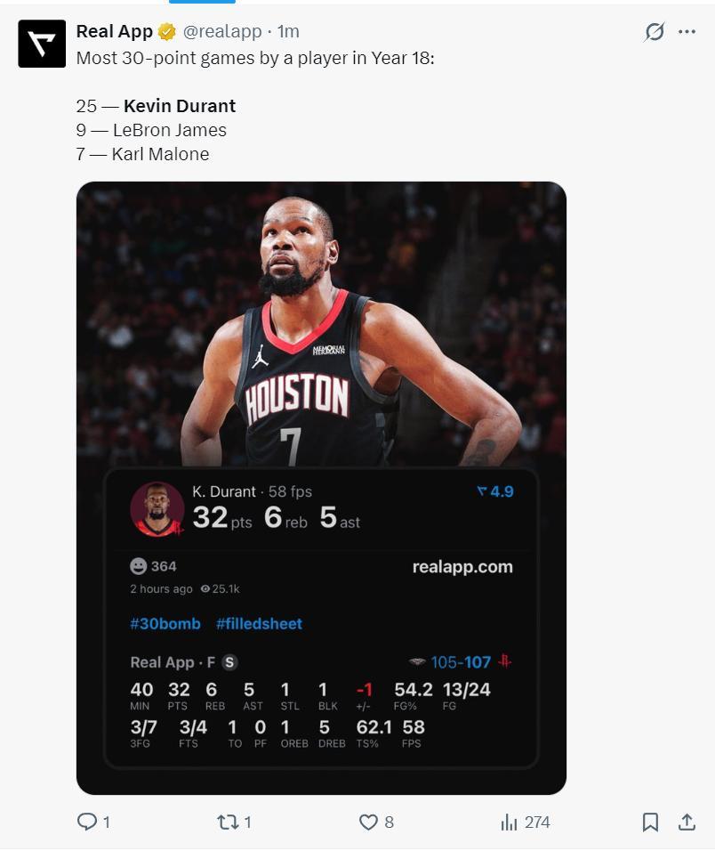 在生涯第18個賽季拿到25次30+的球員杜蘭特歷史第一,詹姆斯只有9次,卡爾馬龍只有7次。