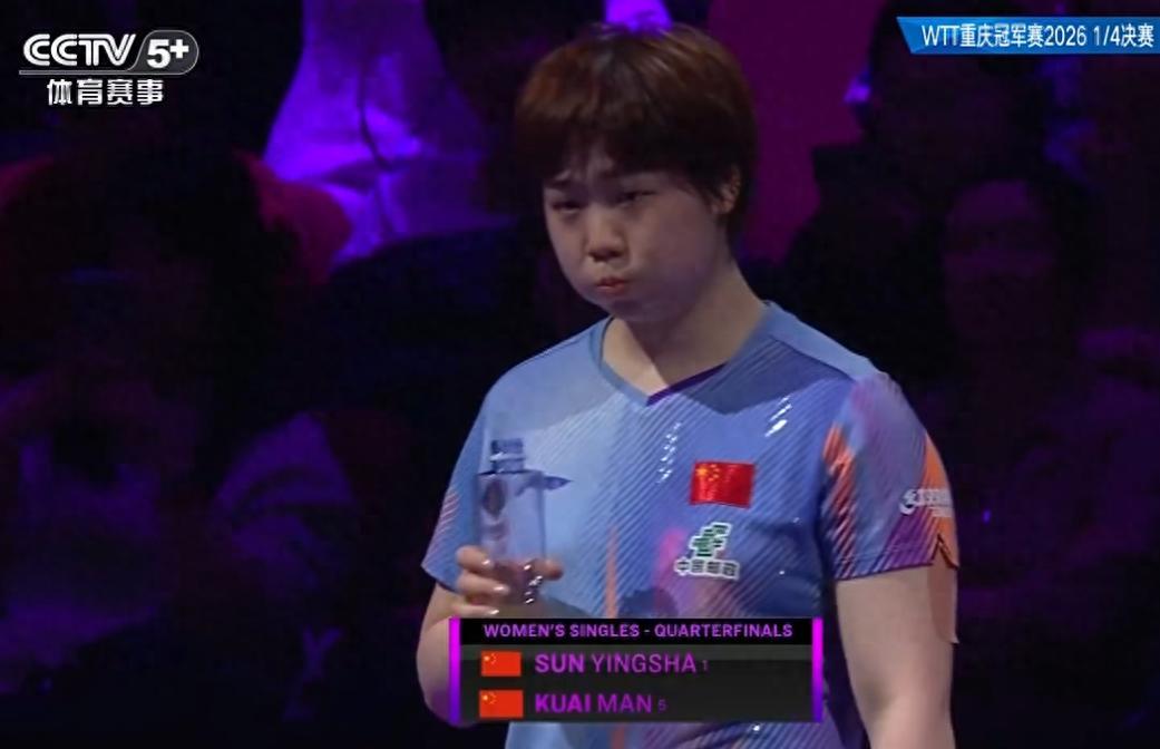 北京時間3月14日,WTT重慶冠軍賽女單1/4決賽,國乒內戰,蒯曼以4-2擊敗孫穎莎,六局比分:6-11、11-7、16-14、11-7、9-11、11-2。世界第一的孫穎莎三連冠夢碎,除此之外女單世界前四一同出局無緣四強。
