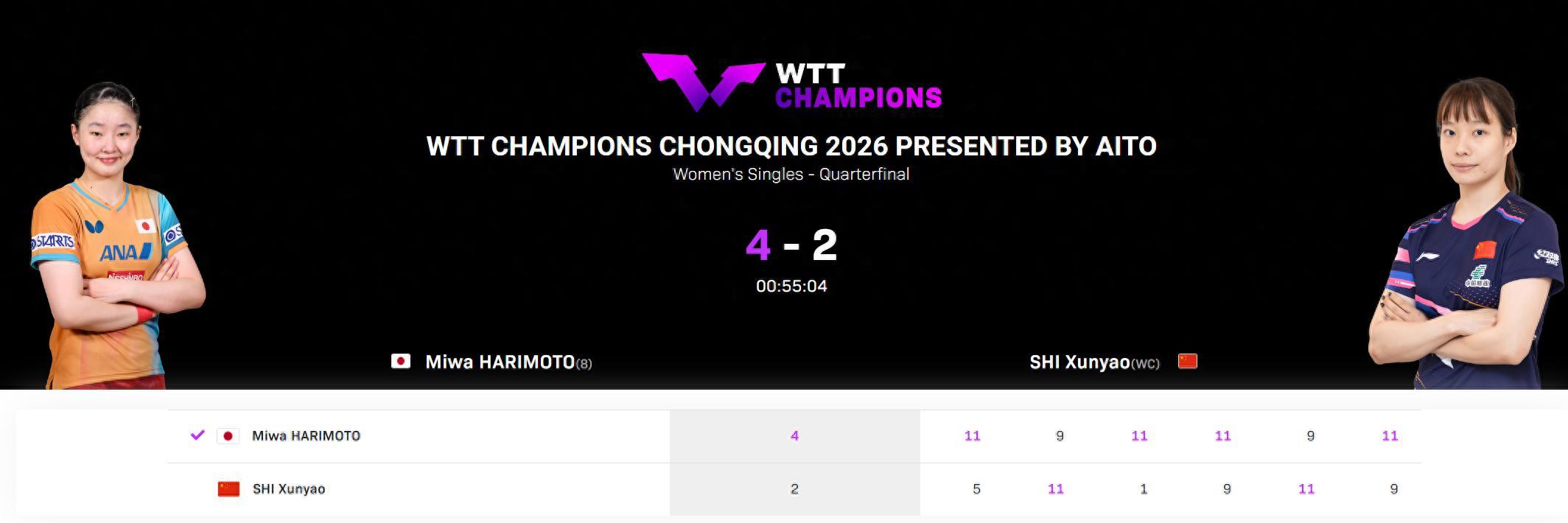 第四局開場張本美和打得很順4-0領先,她肯定想復刻第三局但這一次石洵瑤沒有崩盤追到5-7,張本美和8-6繼續領先,張本美和10-8局點,最終張本11-9再下一城。