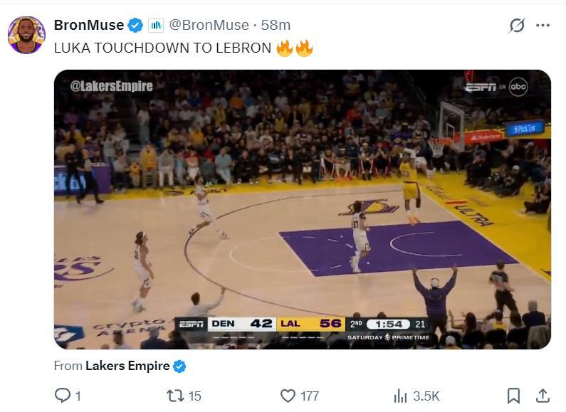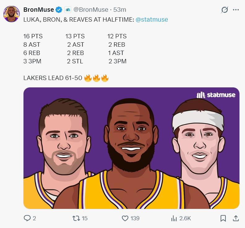 湖人三巨頭上半場的發揮都不錯,東契奇16分8助攻6籃板,詹姆斯13分2籃板2助攻2搶斷,裏夫斯12分2籃板1助攻,湖人也一度領先17分。