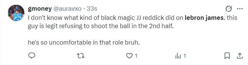湖蜜:我不知道雷迪克是怎麼設置的戰術,他不讓詹姆斯在下半場投籃了,詹姆斯在下半場有機會都不投,詹姆斯在這個角色中太不自在了。
