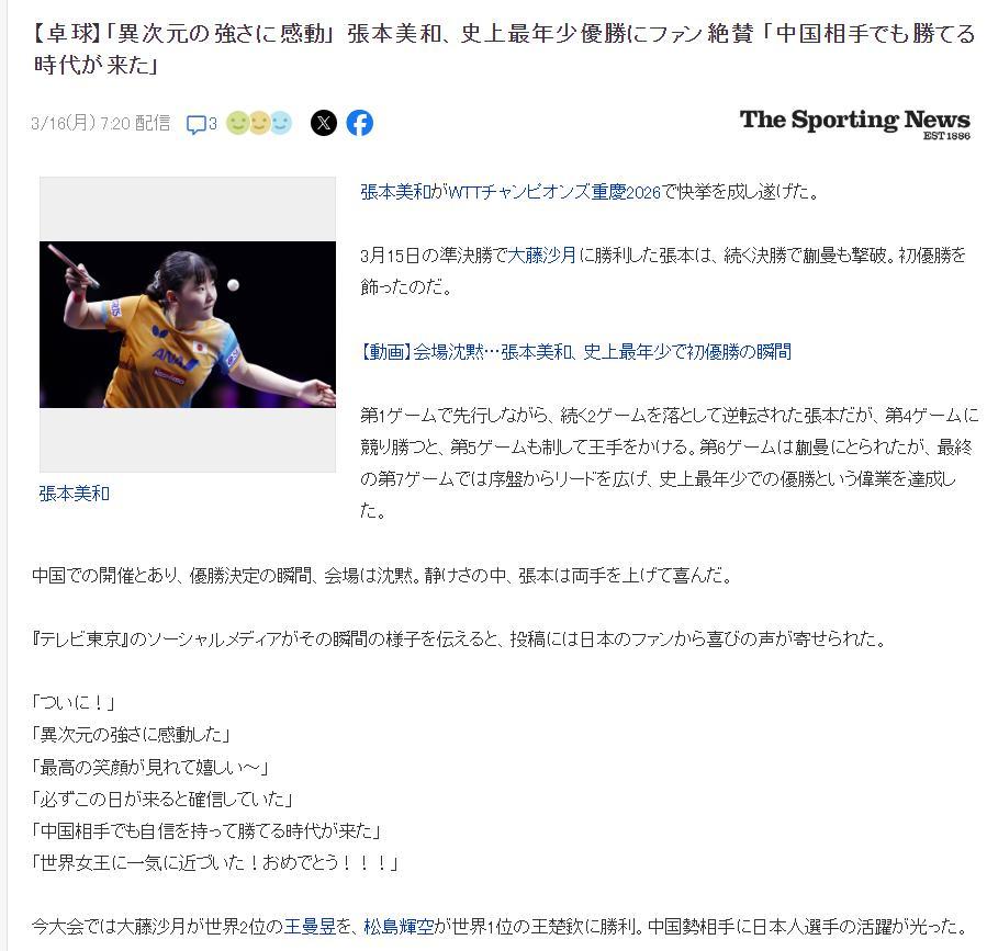 日本媒體《The Sporting News》寫道:被張本美和的‘異次元實力’所感到,她成爲歷史最年輕的冠軍賽冠軍,日本粉絲們高呼‘能戰勝中國強手的時代到來了’。
