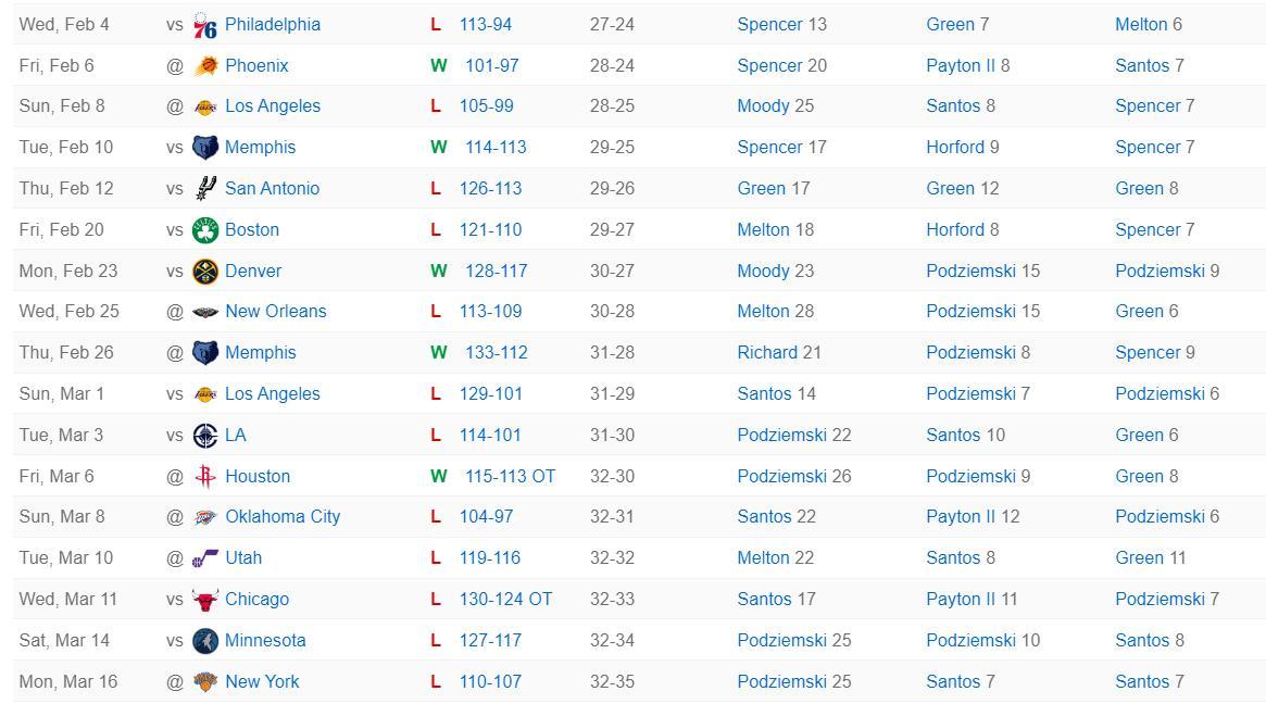勇士隊領先21分被逆轉吞下五連敗,終場前28秒波傑姆斯基拼下後場籃板,在終場前23秒錯失了反超的三分球,終場前16秒桑托斯對沙梅特犯規,隨後沙梅特兩罰全中拉開到3分,終場前7秒波傑姆斯基搶了一個兩分,但隨後阿奴諾比兩罰全中,終場前1秒桑托斯傳球失誤。