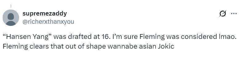 美球迷:楊瀚森第16順位就被選中了,但我相信太陽的弗萊明一定覺得很滑稽,楊瀚森只是一個空有中國約基奇名頭的糟糕傢伙。