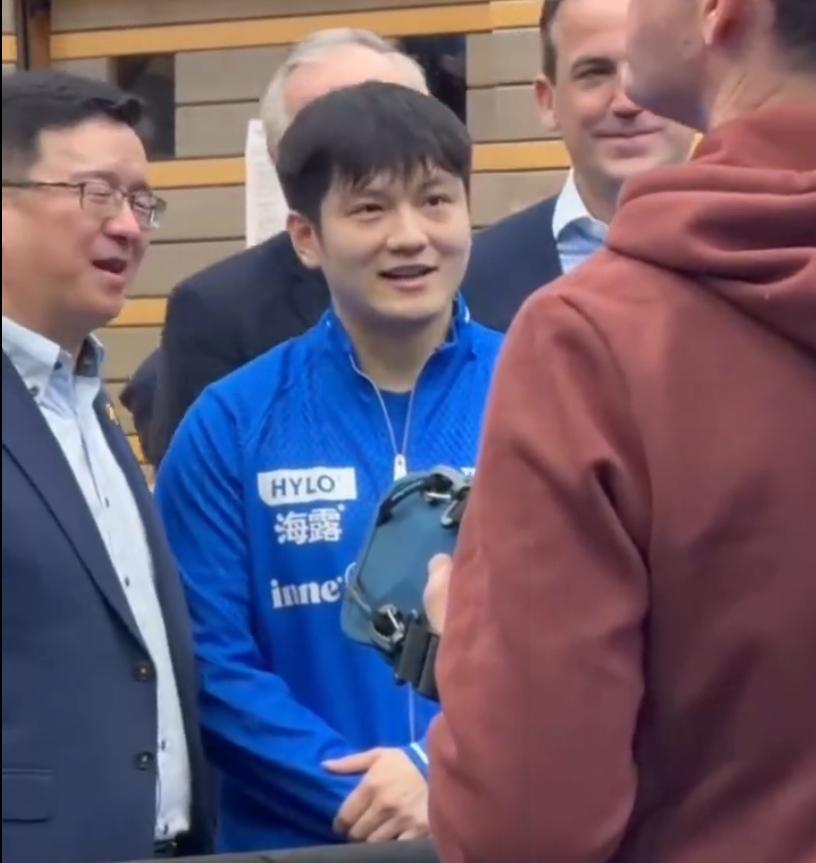 樊振東的臉上一直都洋溢着歡樂的氣息,他在與領事合影後兩人也相談甚歡,可以看出樊振東是真的非常開心。