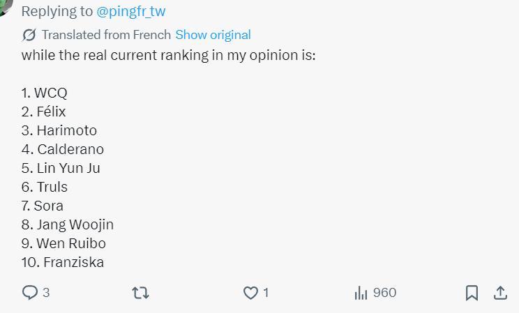 一位英國球迷心目中的現役前十,王楚欽第一,小勒第二,張本第三,溫瑞博第九。