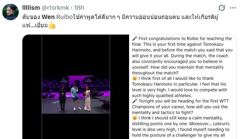 全世界的球迷都認識到了這位19歲的小將,泰國球迷:溫瑞博在擊敗張本智和後用詞很有感情,他溫和謙遜,他給了失敗者最高的敬意。