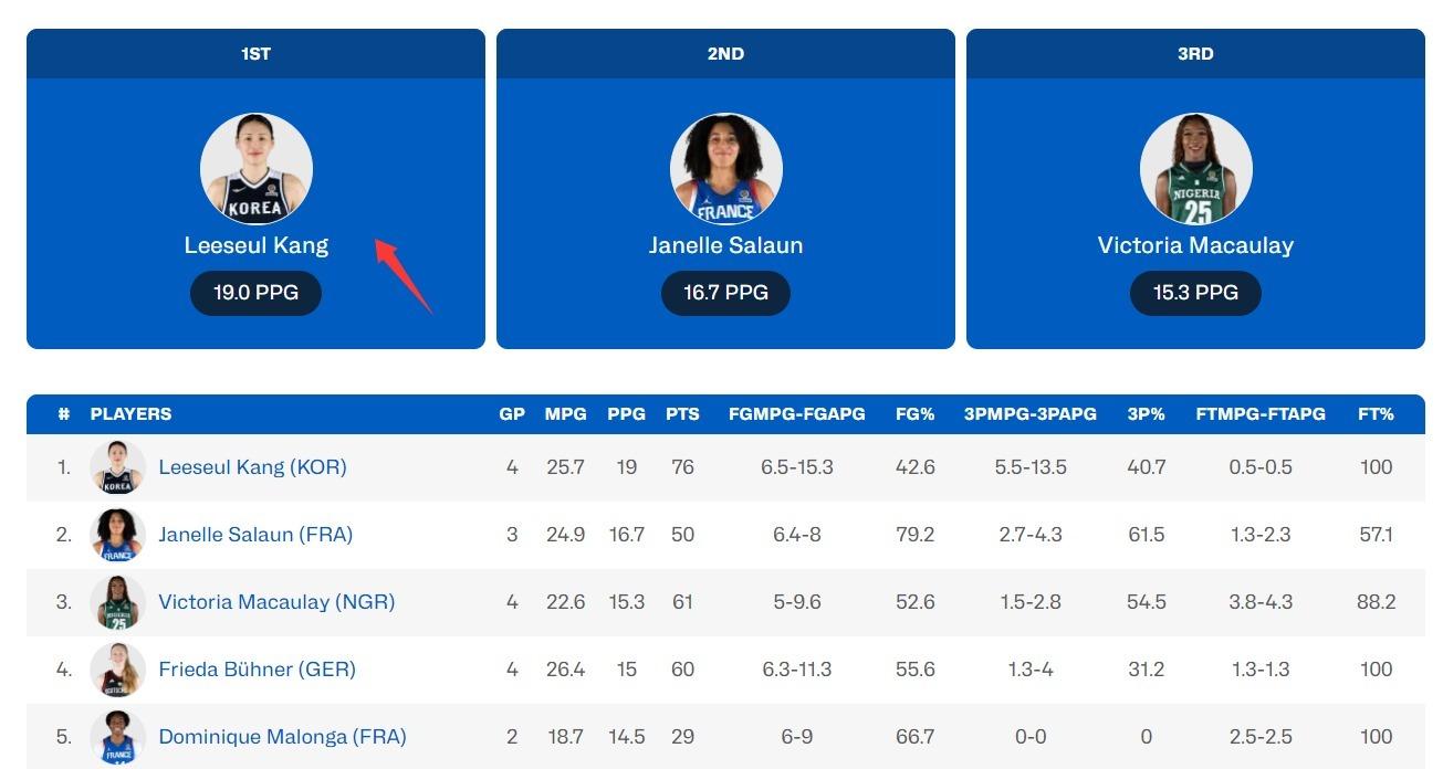 姜怡瑟場均19分是該分區第一,場均5.5個三分球也是分區第一,場均2個搶斷也是分區第一,不得不說這位32歲的老將真的是以一己之力扛起了孱弱的韓國女籃。
