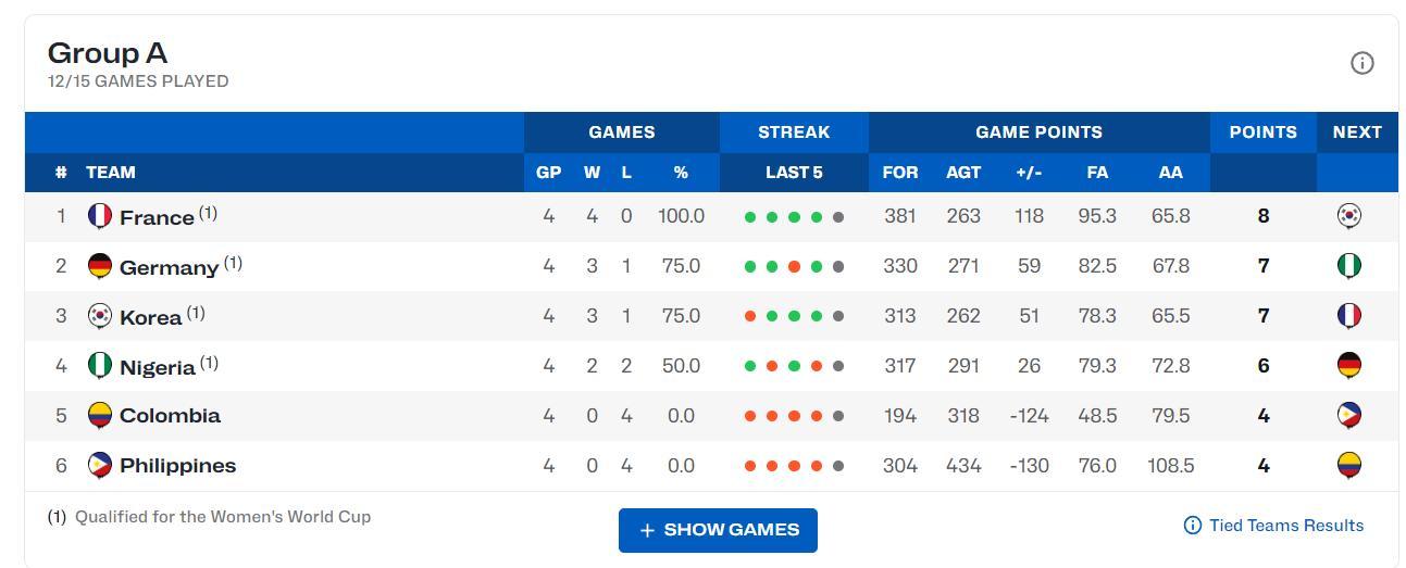 韓國隊目前3勝1負排在小組第三,淨勝分+51,目前韓國隊只輸給了德國隊,餘下一場比賽是對陣小組第一的法國隊,這場比賽韓國隊大概率也要失利,但德國隊是東道主不佔用晉級名額,換言之韓國隊就算輸掉最後一場也會鎖定一張世界盃的門票。
