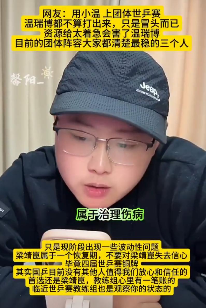 解說員致遠則有不同意見,他認爲梁靖崑只是階段出現一些波動,因爲梁靖崑是一個恢復期,畢竟是四屆世乒賽銅牌不要對他失去信心。目前國乒男隊沒有人值得我們放心和信任,首選還是梁靖崑,教練組心裏有一筆賬的,臨近世乒賽教練組肯定也在考察狀態。