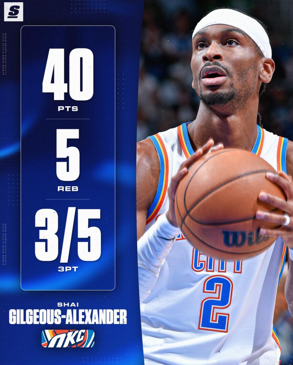 這場比賽亞歷山大35分鐘37秒,27中14,三分5中3,罰球11中9,拿到40分5籃板2助攻4搶斷,命中率51.9%,三分命中率60%,真實命中率62.8%。他繼續刷新連續20+場次的紀錄。
